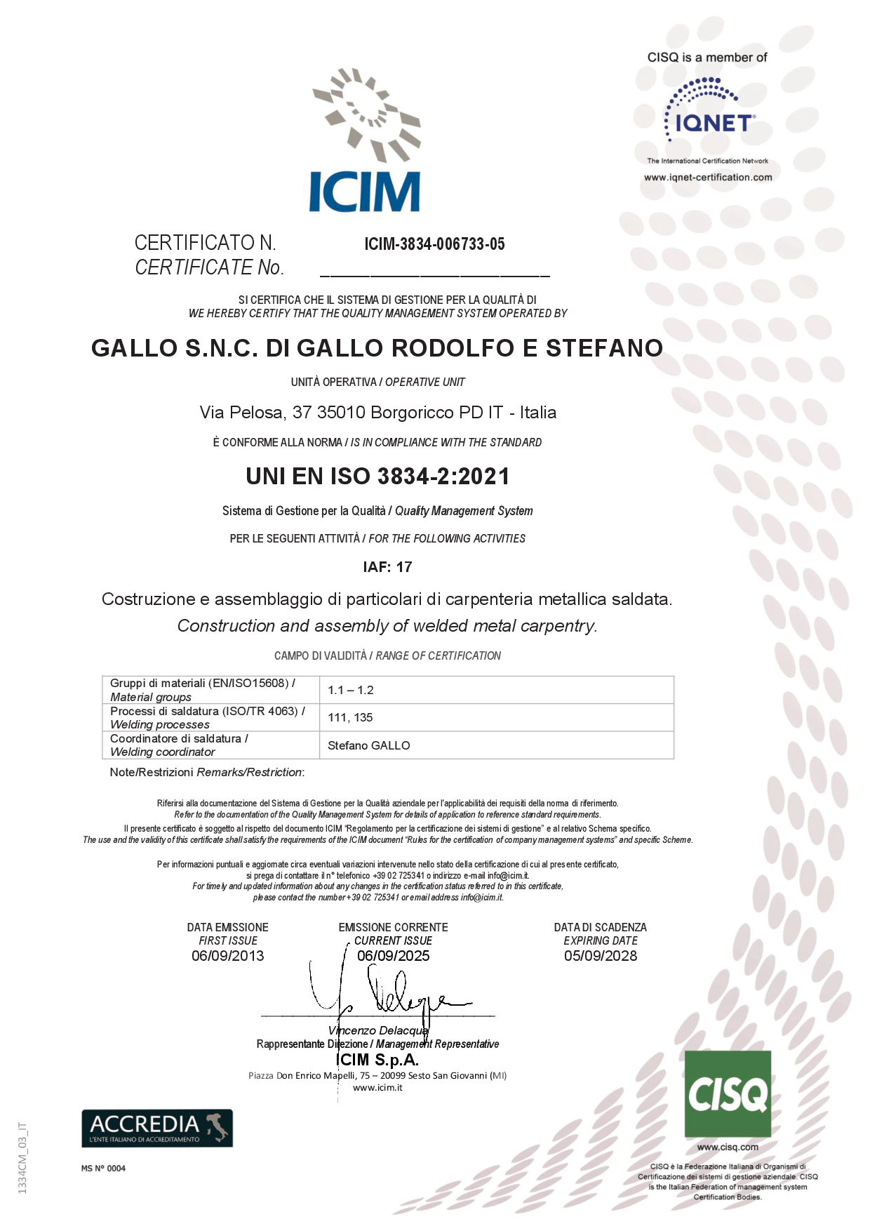 Questi attestati sono rilasciati da ICIM s.p.a., membro della Federazione CISQ, e aderente al circuito internazionale IQNet (The International Certification Network), il più grande network mondiale di organismi di certificazione operanti nel campo della certificazione.