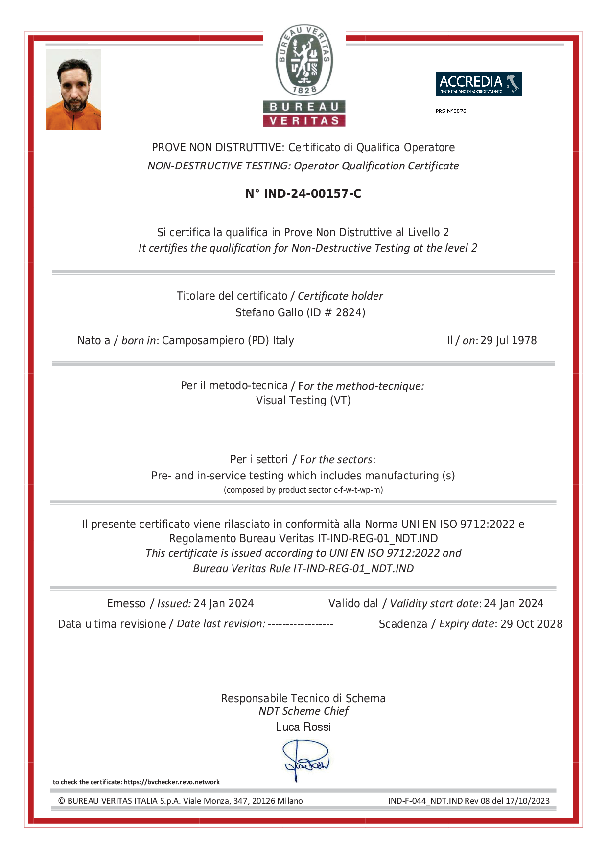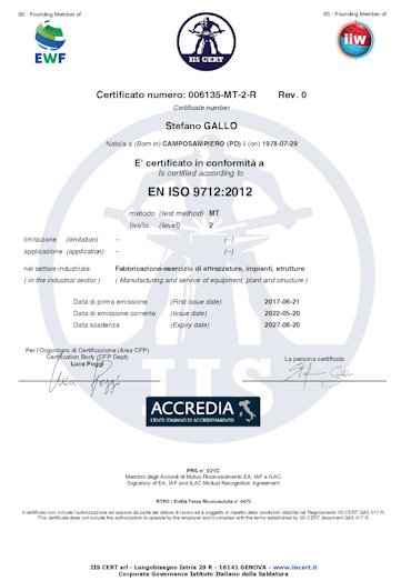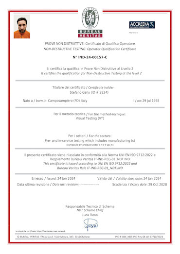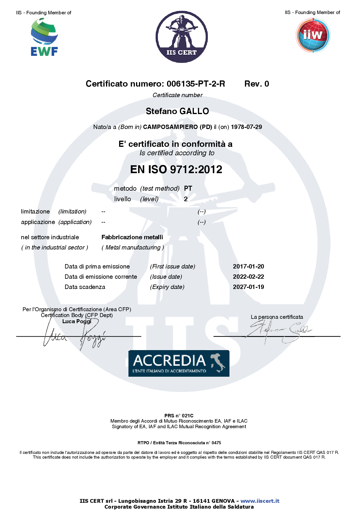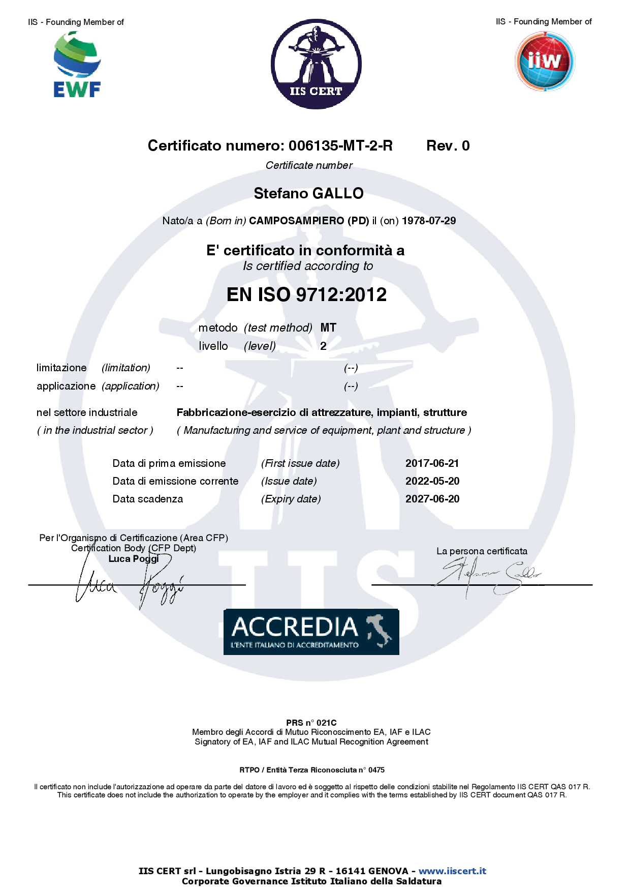 Le nostre certificazioni sono rilasciate dagli enti Bureau Veritas Italia s.p.a. e IISS CERT (istituto italiano della saldatura - certificazioni) e rispondono alla normativa UNI EN ISO 9712:2012.