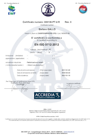 Siamo abilitati al livello 2 per controlli di tipo visivo (VT), magnetoscopico (MT) e liquidi penetranti (PT).