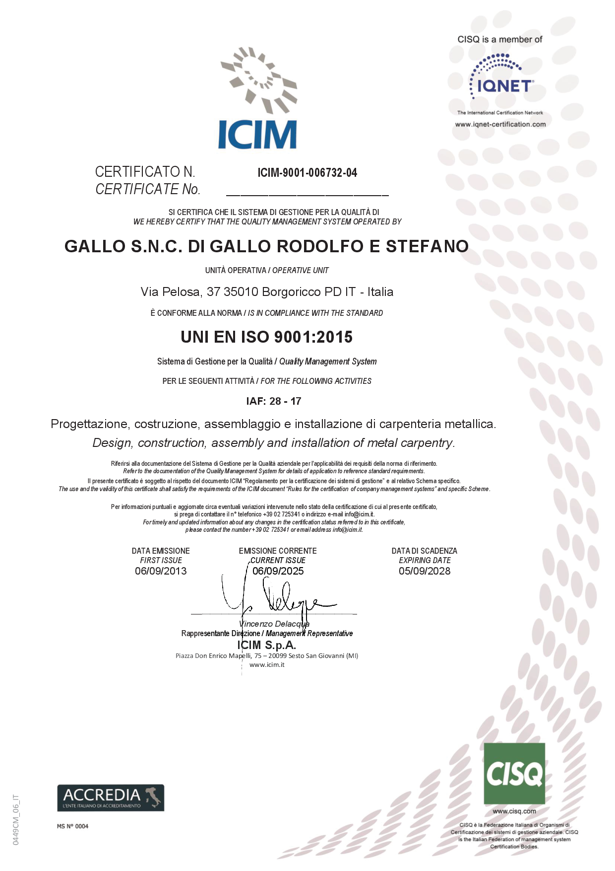 Con grande soddisfazione la GALLO S.N.C. è lieta di comunicarvi che è stata rinnovata la certificazione della nostra azienda per la Gestione del Sistema della Qualità con campo applicativo la progettazione, la produzione e l'assemblaggio di carpenteria metallica secondo quanto previsto dalla normativa UNI EN 9001:2015 La Gallo snc si impegna quindi, attraverso il rinnovo e il mantenimento di queste procedure e di questi modelli organizzativi, a continuare ad assicurare alla clientela un servizio adeguato e garantito in linea con le normative presenti attualmente.